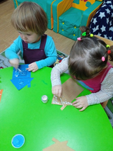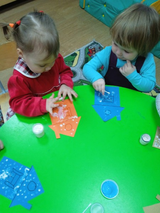 Далее малышам было предложено заняться творческой деятельностью, где они украшали, из заранее подготовленных трафаретов, зайкину избушку, используя один из методов нетрадиционного рисования - тычком, используя белую гуашь и ватную палочку.