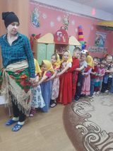 Хороший эмоциональный настрой подарили детям «ряженые»- сотрудники детского сада. В гости к ребятам пришли сказочные персонажи Чёрт и Медведь. Своим гостеприимством порадовала ребятишек хозяйка «Акулинина двора». Она предложила детям поучаствовать в традиционных рождественских играх, хороводах, угостила их сладостями.